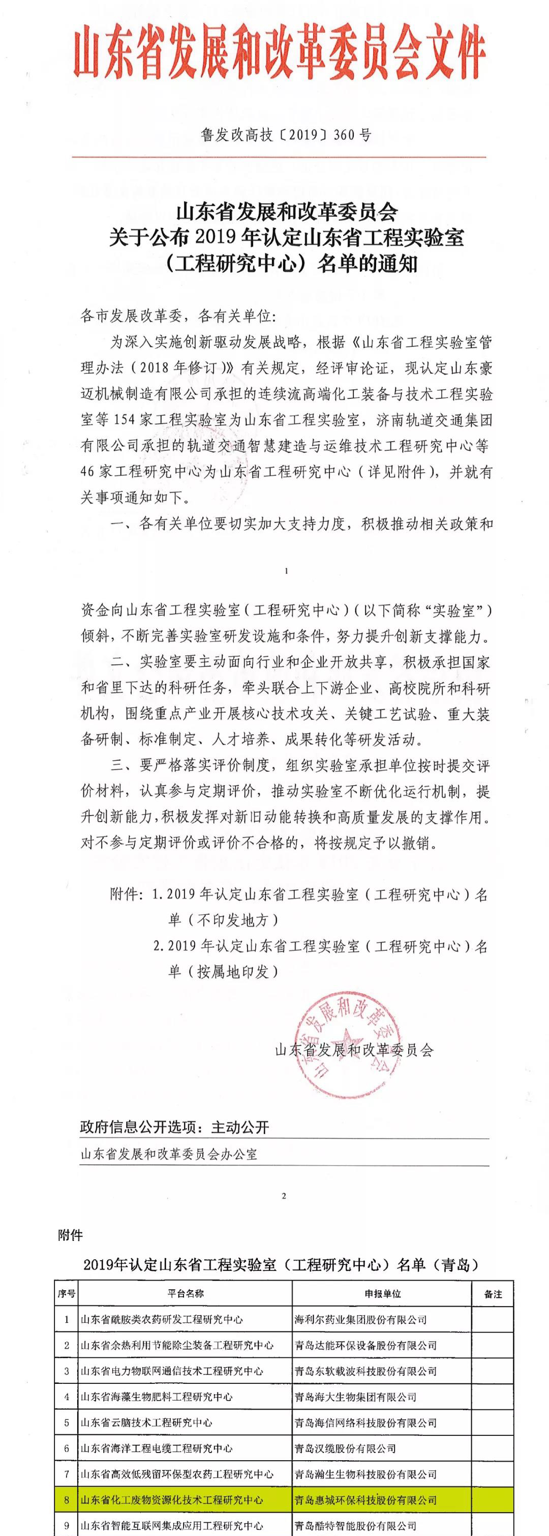 前,根據(jù)山東省發(fā)展和改革委《關(guān)于公布2019年認(rèn)定山東省工程實(shí)驗(yàn)室(工程研究中心)名單的通知》(魯發(fā)改高技〔2019〕360號(hào))發(fā)布文件,我公司申報(bào)的省級(jí)工程研究中心獲批并被認(rèn)定為山東省化工廢物資源化技術(shù)工程研究中心。