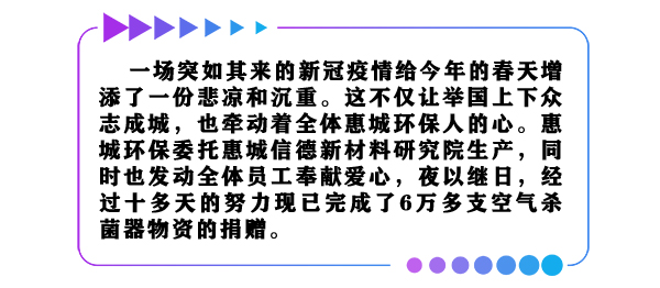 隨后,裝載五萬(wàn)支殺菌器的車輛啟動(dòng),它將承載全體惠城環(huán)保人的愛心,駛達(dá)最急需的防疫一線。