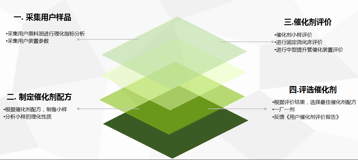 銷售人員負(fù)責(zé)售前采集客戶生產(chǎn)工藝數(shù)據(jù)、原料油樣品等,然后交由技術(shù)服務(wù)中心分析,研發(fā)部根據(jù)分析結(jié)果制備催化劑小樣,通過重油微反實(shí)驗(yàn)裝置、固定流化床實(shí)驗(yàn)裝置和中型提升管催化裂化裝置,對(duì)催化劑配方篩選和工藝效果實(shí)施三級(jí)評(píng)價(jià),根據(jù)評(píng)價(jià)結(jié)果靈活調(diào)整催化劑配方重復(fù)試驗(yàn)并選定最優(yōu)方案交由生產(chǎn)管理部實(shí)施定制化生產(chǎn)。